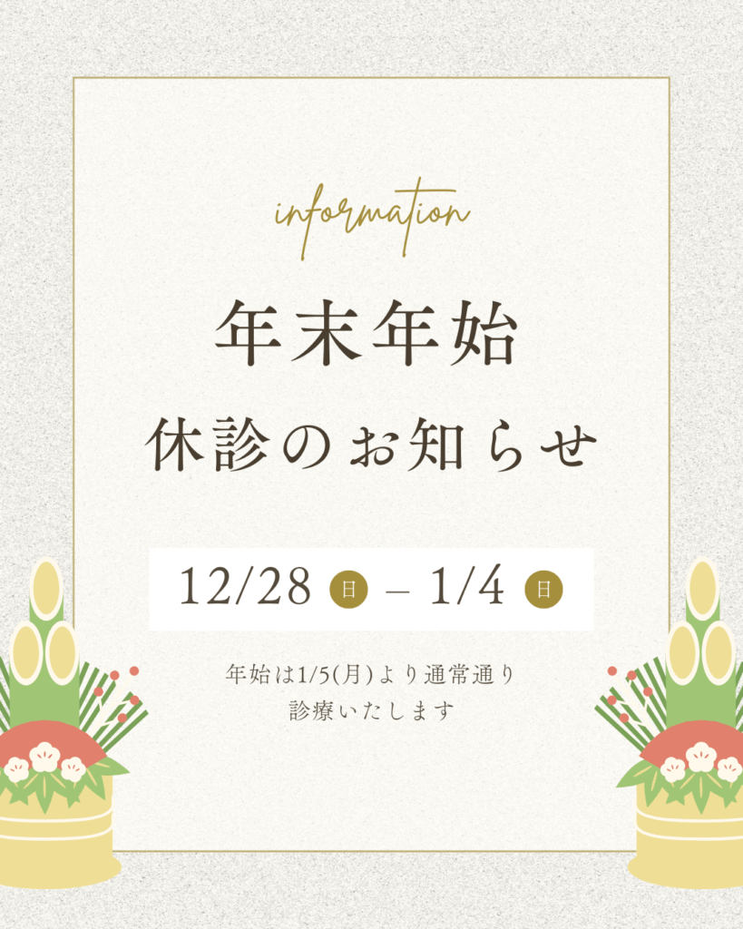 年内は12月27日(土)まで通常通り診療を行い、年始は1月5日(月)より診療を再開いたします。